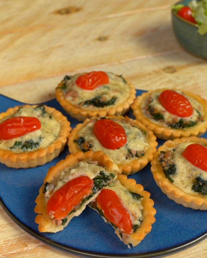 Quiche à la ricotta et au thon La recette en vidéo : Ingrédients 6 minis pâtes à quiche pre-cuites : Pour la garniture : 500g d’épinards 70g de thon en conserve à l’huile, égoutté 1/2 oignon, coupé en dés 3 gousses d’ail, émincées 3 cuillères à soupe d’huile d’olive 50g de tomates cerises Pour le…