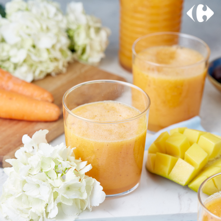 Jus énergisant à l’orange Ingrédients 470 ml d’eau 1 orange, coupée en cubes 1 verre de carottes, coupées en cubes 1 verre de poire, épépinée et coupée en dés 1 mangue, coupée en cubes 1 ananas, coupé en cubes 1 cuillère à café de jus de citron 1/2 cuillère à café de curcuma 2 dattes…