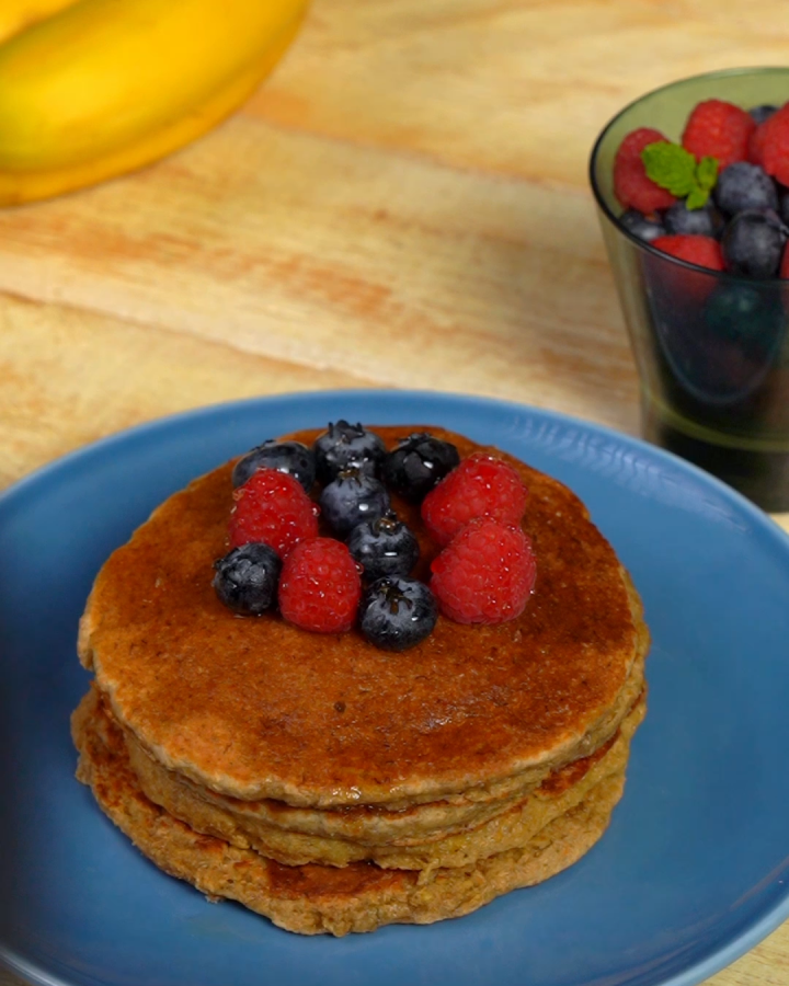 Pancakes aux bananes La recette en vidéo : Ingrédients 200g de farine de blé complet 2 œufs 2 bananes, écrasées 2 sachets de sucre vanille 11g de levure chimique 15g de beurre, fondu 200ml de lait, à température ambiante Pour décorer : 50g de fruits rouges Préparation 1- Dans un bol, placez la farine complète,…