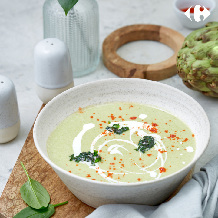 Soupe de fèves et artichauts Ingrédients 150g de fèves, pelées 150g de fonds d’artichauts, coupés en petits cubes 2 gousses d’ail, hachées 2 cuillères à soupe d’huile d’olive 3 oignons verts, coupés en petits morceaux 2 cuillères à soupe de crème épaisse 50g d’épinards Sel et poivre au goût 1 litre de bouillon de poulet…