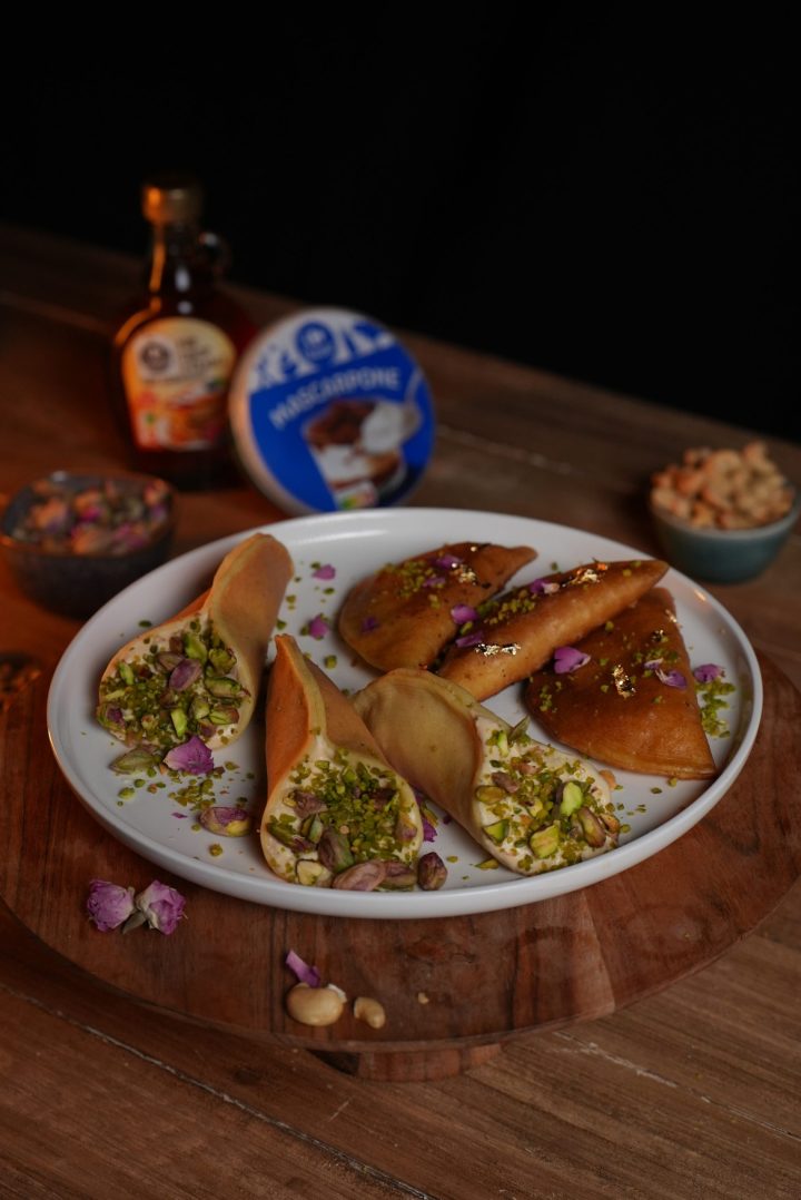 Qateyef au fromage et pistache Ingrédients Pour la pâte des qatayef: 1 verre de farine 2 verres de semoule extra-fine 500 ml de lait (ou plus si nécessaire) 2 cuillère à soupe de levure chimique 3 cuillère à soupe de sucre Pour la crème : 250 g de mascarpone Carrefour Classic’ 200 g de lait…